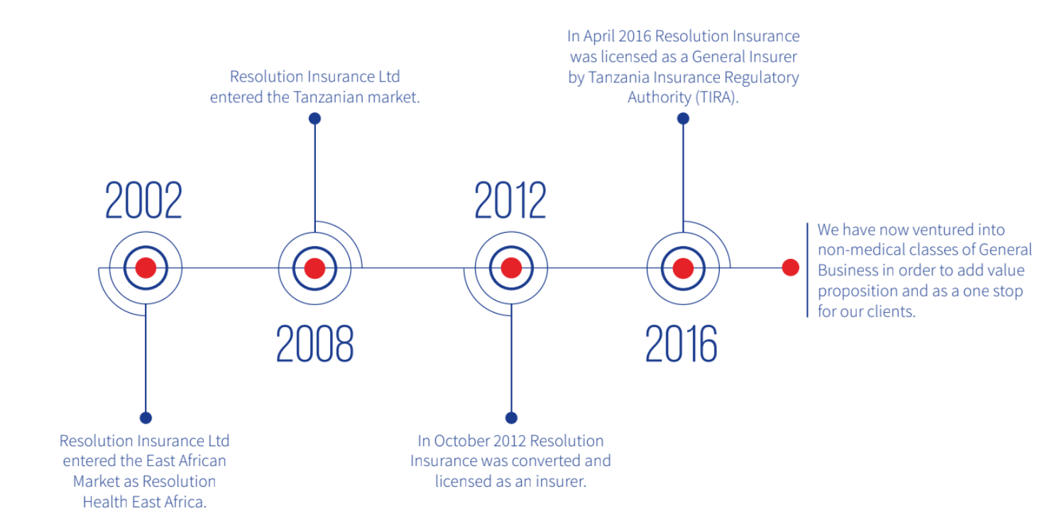 In October 2012, Resolution Insurance was converted and licensed as an insurer, and in April 2016, it was licensed as a General Insurer by the Tanzania Insurance Regulatory Authority (TIRA).